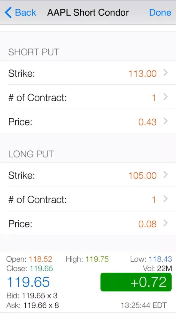 A dedicated app to help investors build, evaluate, and study various options Condor strategies easily and quickly, e.g. Iron Condor, Long Condor, etc. It comes with a highly-praised and fast loading options chain, touch based interactive profit/loss graphs, simulator of the time decay and Implied Volatility change, etc. It provides the fastest way to plan your Condor strategy. Plus, Real-Time underlying stock quotes and current Implied Volatility are included. You can further customize and manage your strategies.