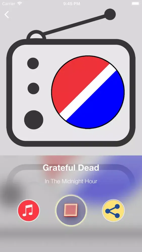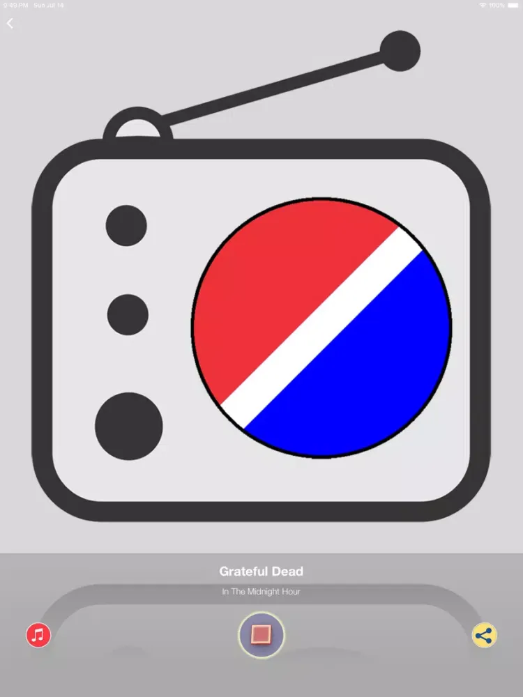 Radio that plays music of Grateful Dead, solo projects of band members and music of related artists. Shows name of artist and song title, also cover art.