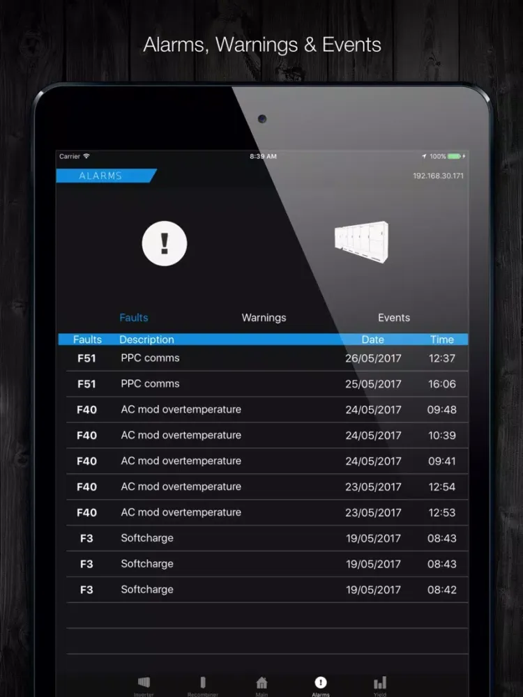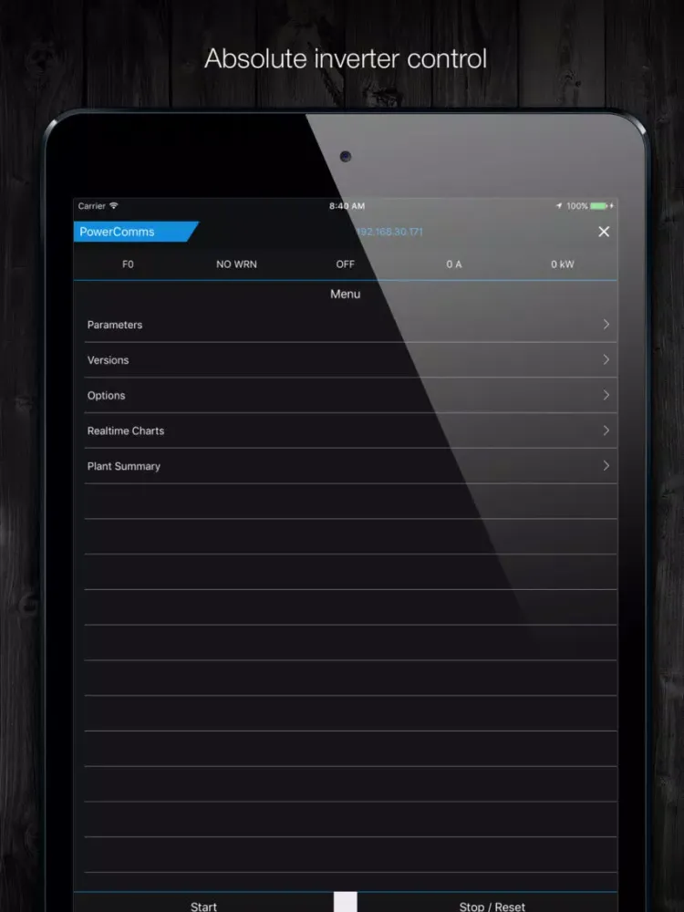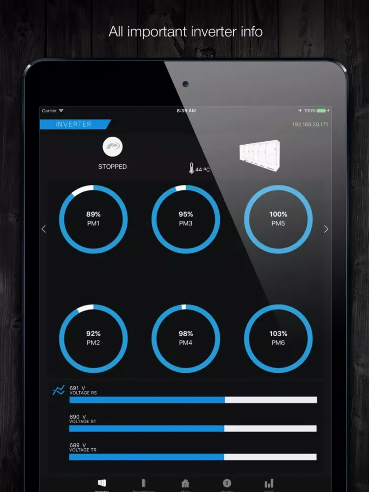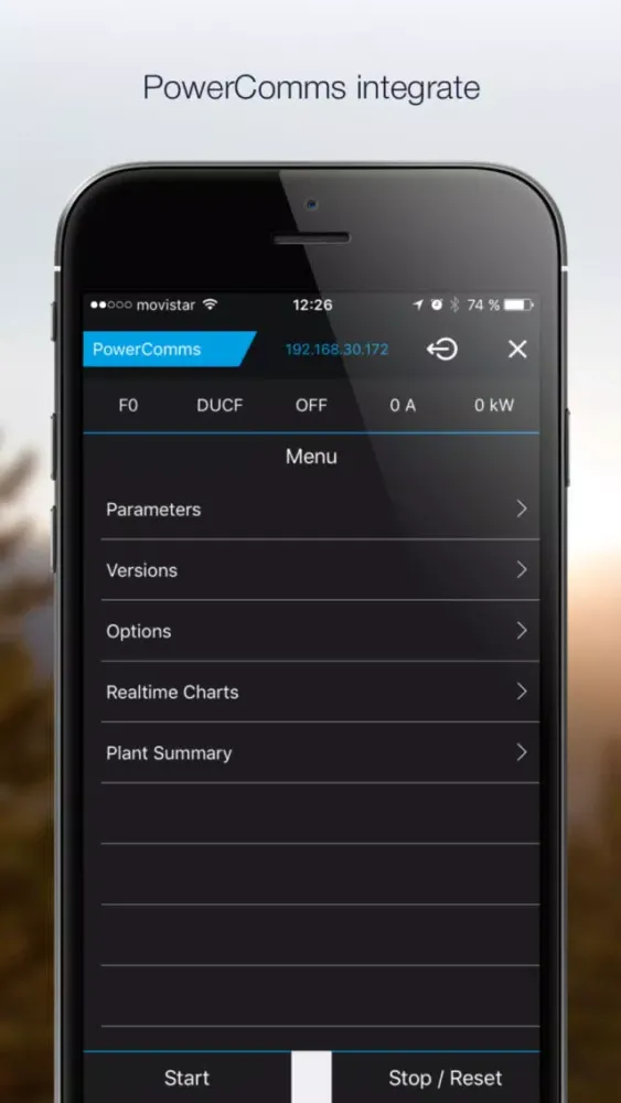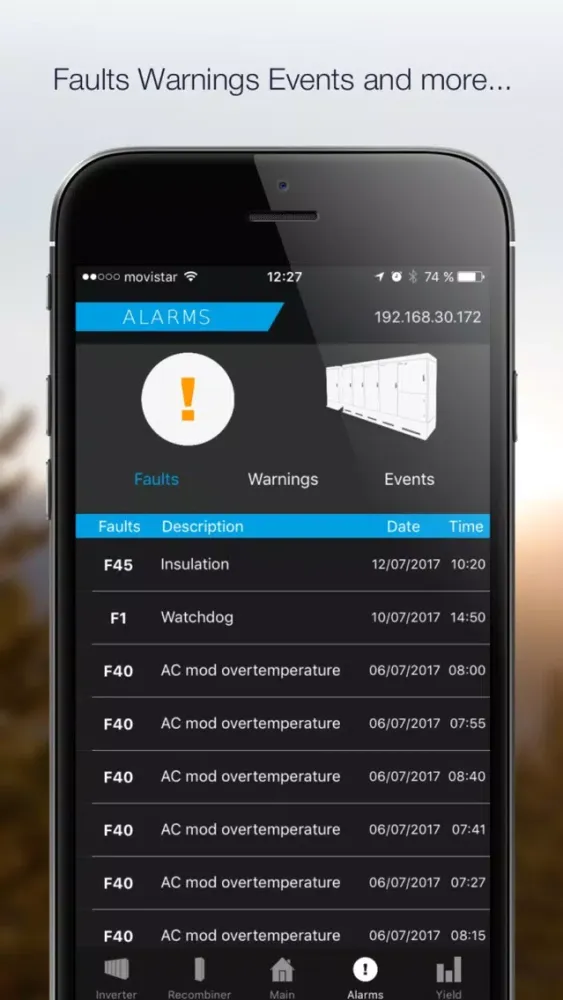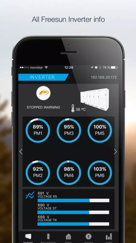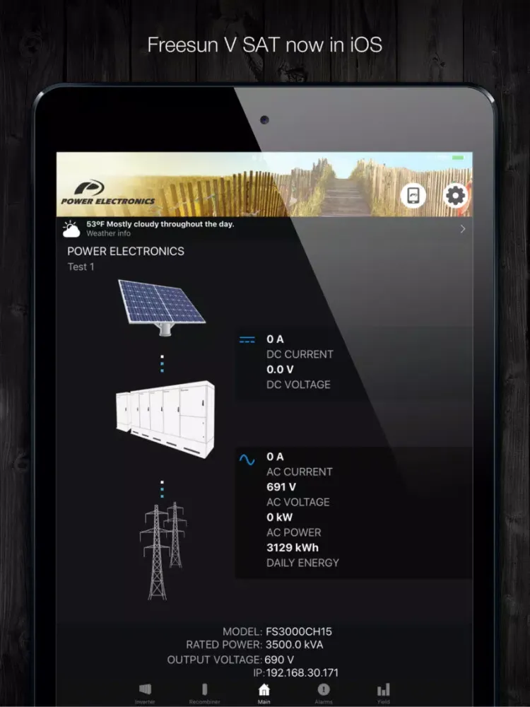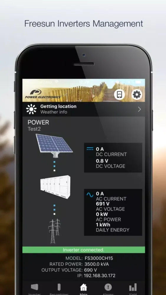 New App Freesun by Power Electronics for iPhone and iPad. The ultimate Freesun app will play a key role of your Plant Service and Management. Any iOS device will be easily wirelessly connected to the inverter creating a comprehensive and user friendly interface. Forget about using built-in displays with tiny screens and tedious menus, and allow your field technicians to service outdoor units under rain, snow or heavy sunny conditions, without opening or standing in front of the unit..Freesun app is a comprehensive app compatible with iOS devices. This allows the user to monitor the inverter status.