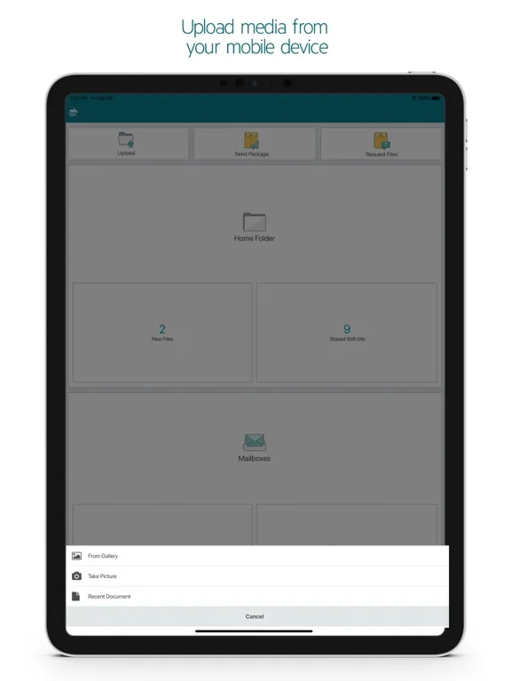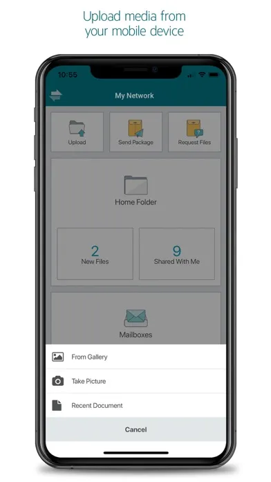 Upload files from your camera roll; or record live video, audio, or photos directly from your device's camera. Access any file types and open them with other applications on your mobile device. Forward file packages to others through the app, without the need to download the file to your mobile device. Request and review delivery receipts and know when recipients have read the message.