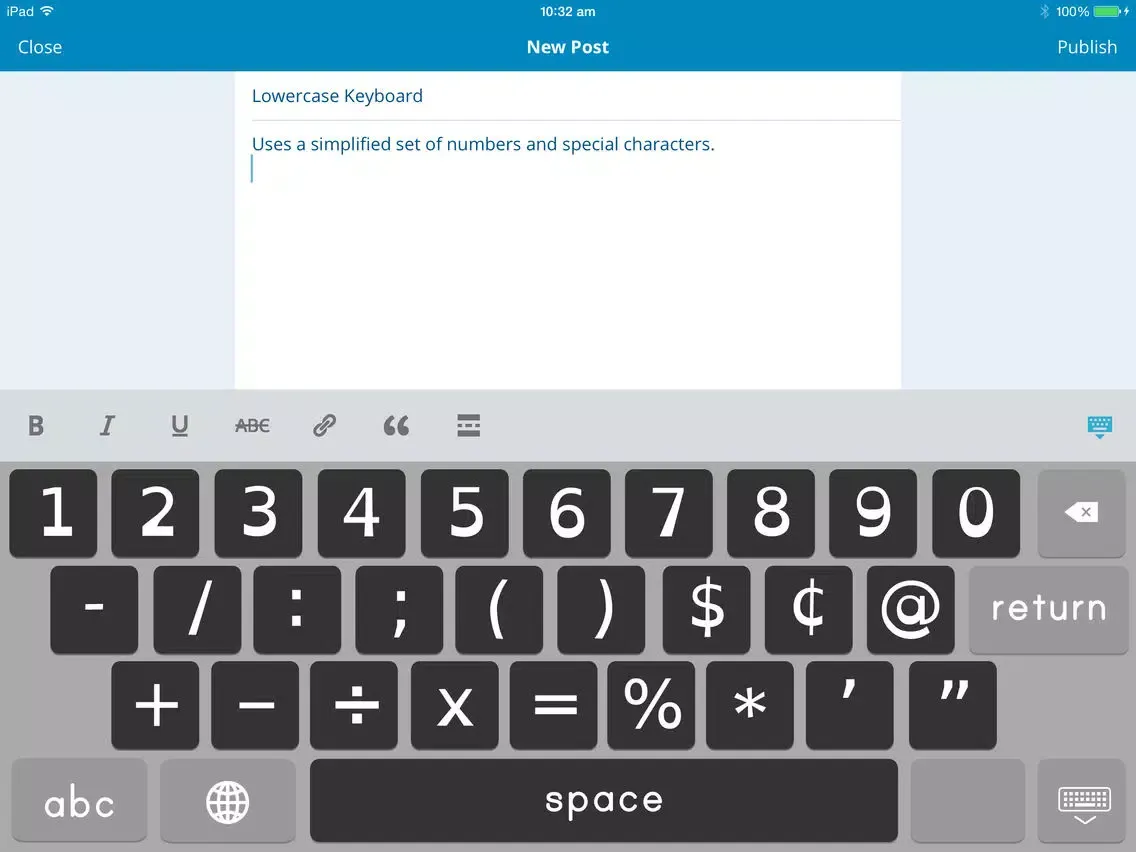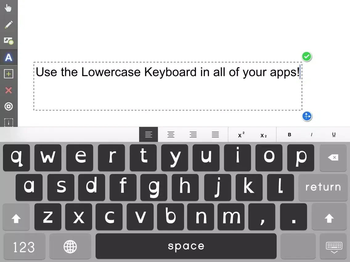 Lowercase Keyboard is a custom keyboard that uses both lowercase and uppercase letters, as well as a simplified set of numbers and special characters. The keyboard has been designed with elementary students in mind.