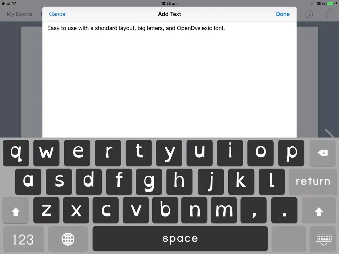 Lowercase Keyboard follows the layout of the default keyboard closely so it is easy to use. The font of the Lowercase Keyboard is "OpenDyslexic" which has been created to increase readability for readers with dyslexia.