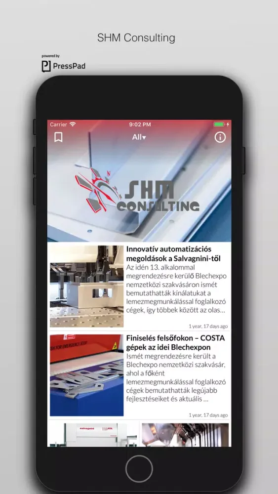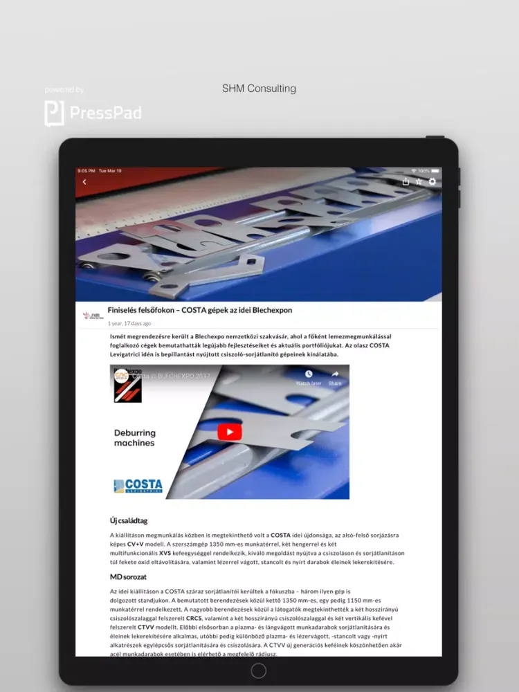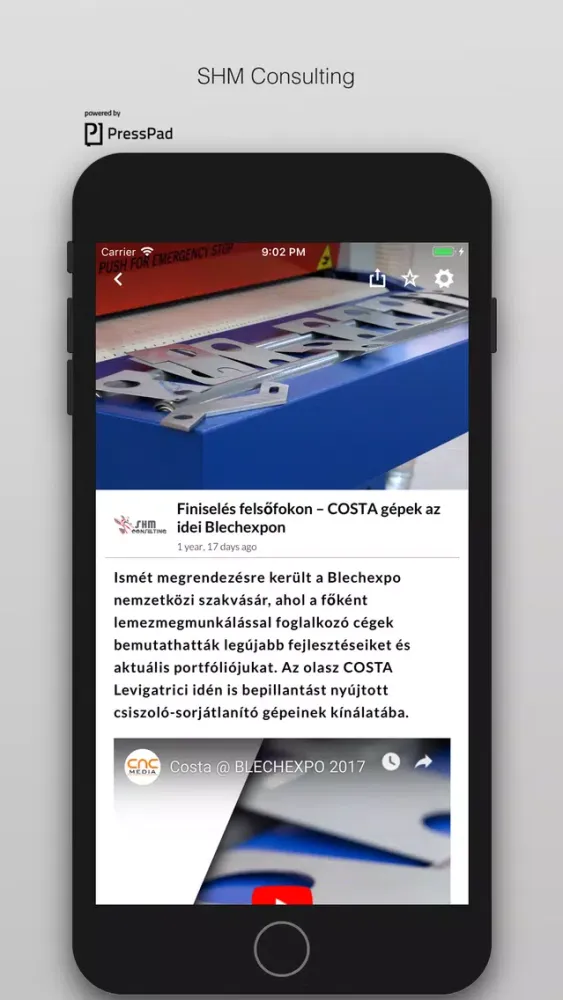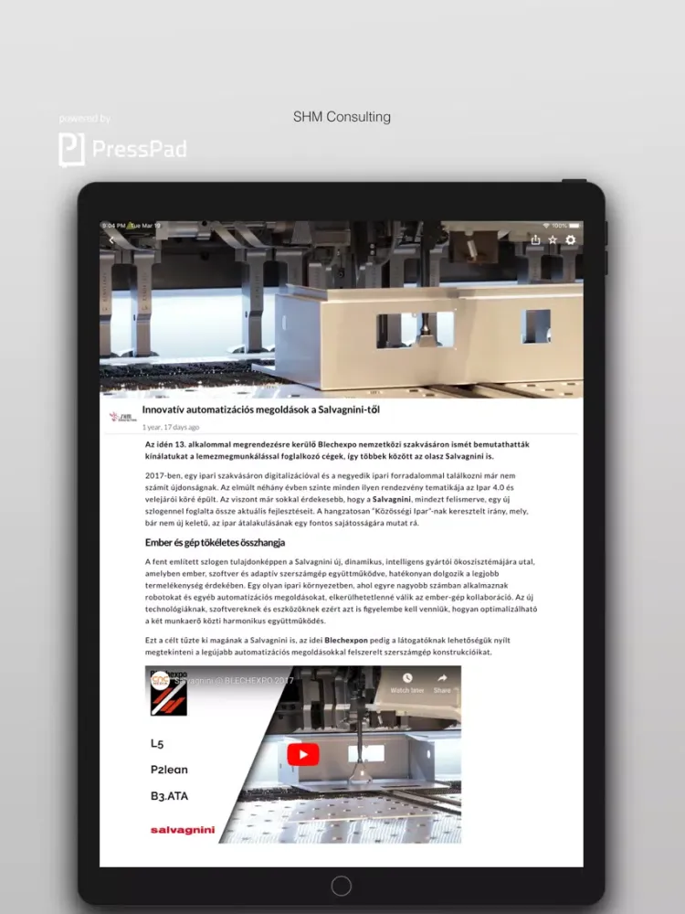 Ez az alkalmazás az SHM Consulting híreit jeleníti meg, a lemezalakítással foglalkozó olvasói számára.\n\nTöbb mint 10 éves szakmai háttérrel kezdtem bele jelenlegi tevékenységembe, a műszaki szaktanácsadás, elsősorban lemezmegmunkálás terén. Az elmúlt évek tapasztalata az volt számomra, hogy a prémium termékek, melyek nagyfokú műszaki felkészültséget igényelnek, nem értékesíthetők a klasszikus, Magyarországon megszokott, kereskedői, viszonteladói formában.\n\nSzámos olyan nagy múltú gyár vette fel velem a kapcsolatot, melyeket már évek óta jól ismertem, s a termékeik forgalmazásában részt vettem, hogy alkossunk valami újat, mely a potenciális, és meglevő vevőinknek azt a szolgáltatást nyújtja, mellyel valóban elégedettek lehetnek.\n\nEnnek köszönhetően látom el ma Magyarországon az alábbi gyárak közvetlen gyári képviseletét, illetve helyi szervizcsapatuk koordinációját. Ezen gyártók közvetlen kapcsolatot szerettek volna az ügyfeleikkel, mert csak így látták biztosítottnak, hogy a partnereik a megfelelő technológiát kapják, a megfelelő szervizháttérrel, s a gépek életútja a Vevőknél biztos támogatást kaphasson.