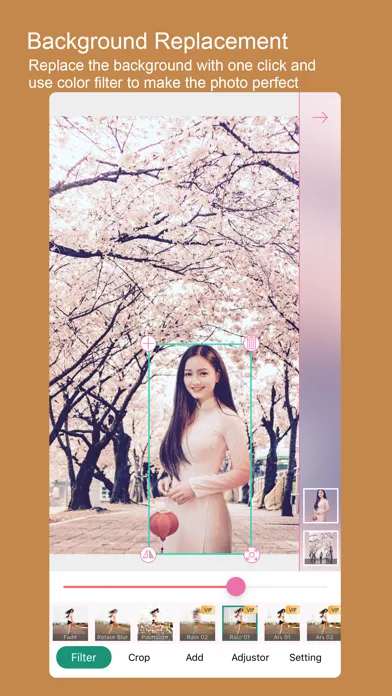 * Supports multi-layer features: support for background replacement, adding multiple cutout subjects as independent layers, and support for filters on different layers and backgrounds.