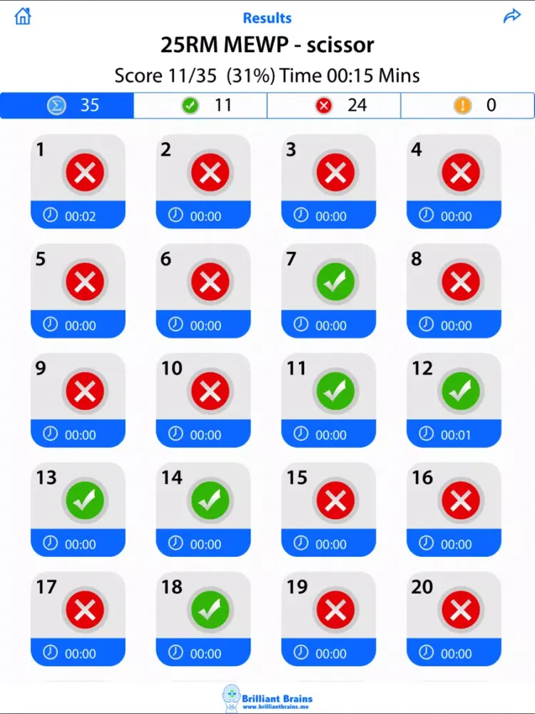 A summary of the practice test is presented at the end of each test. It shows you the time you took, the score, which questions you answered correctly and where you were wrong. And yes, you can E-MAIL the results.