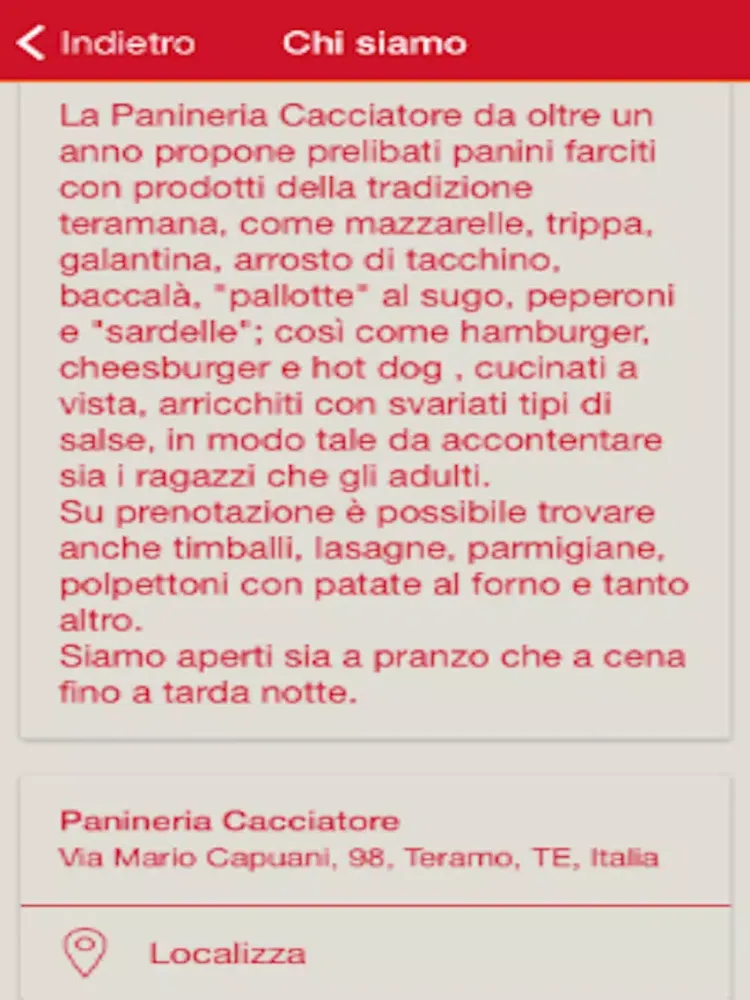 La Panineria Cacciatore da oltre un anno propone prelibati panini farciti con prodotti della tradizione teramana, come mazzarelle, trippa, galantina, arrosto di tacchino,baccalà,pallotte al sugo, peperoni e sardelle,così come hamburger, cheesburger e hot dog , cucinati a vista, arricchiti con svariati tipi di salse, in modo tale da accontentare sia i ragazzi che gli adulti