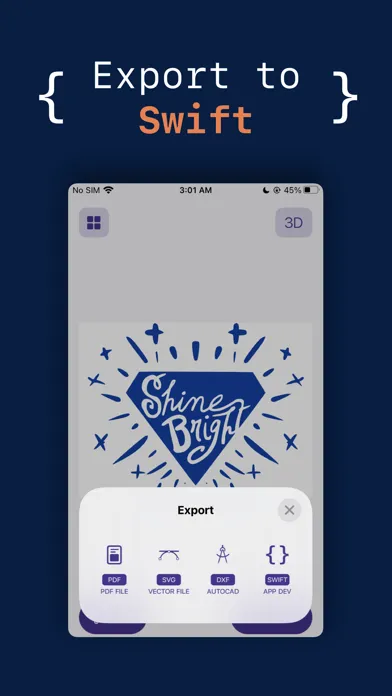 VectorPad allows you to convert your graphics into multiple file formats - SVG (Scalable Vector Graphics), PDF, DXF (Drawing Exchange Format for CAD software) and Swift code with native graphics in seconds.