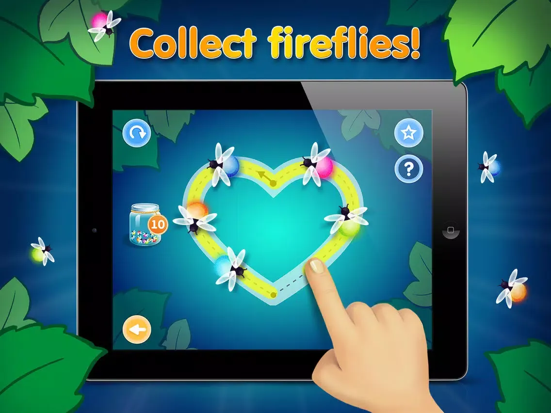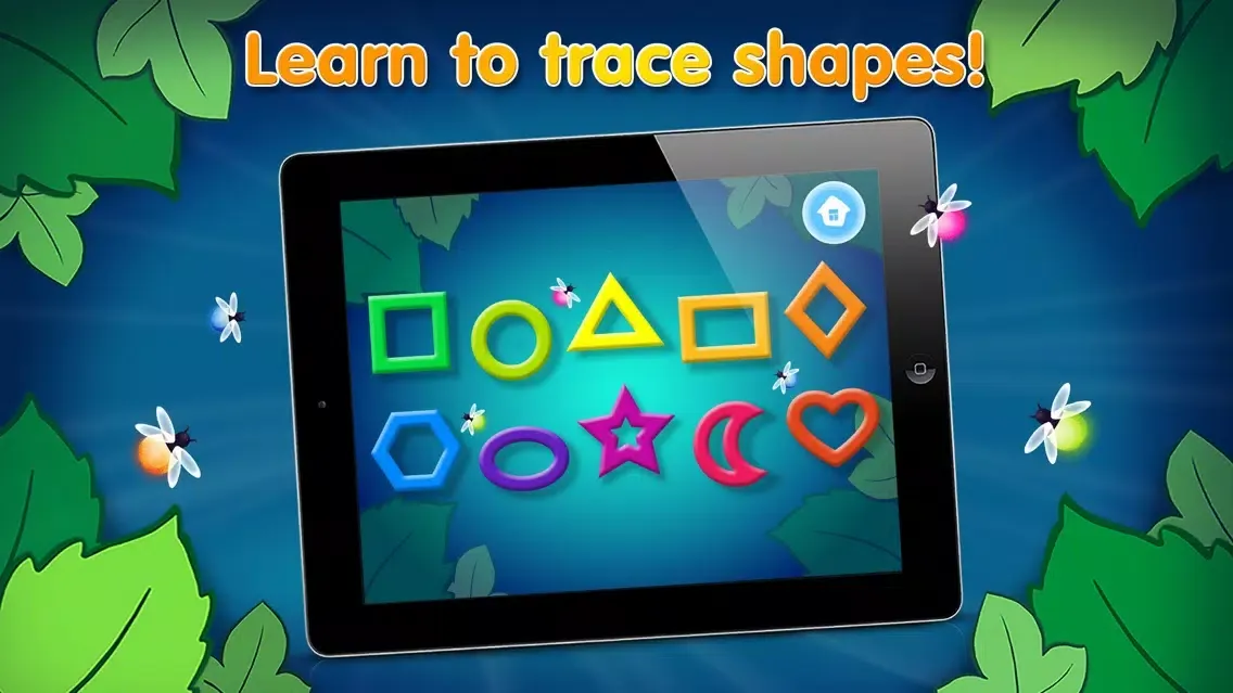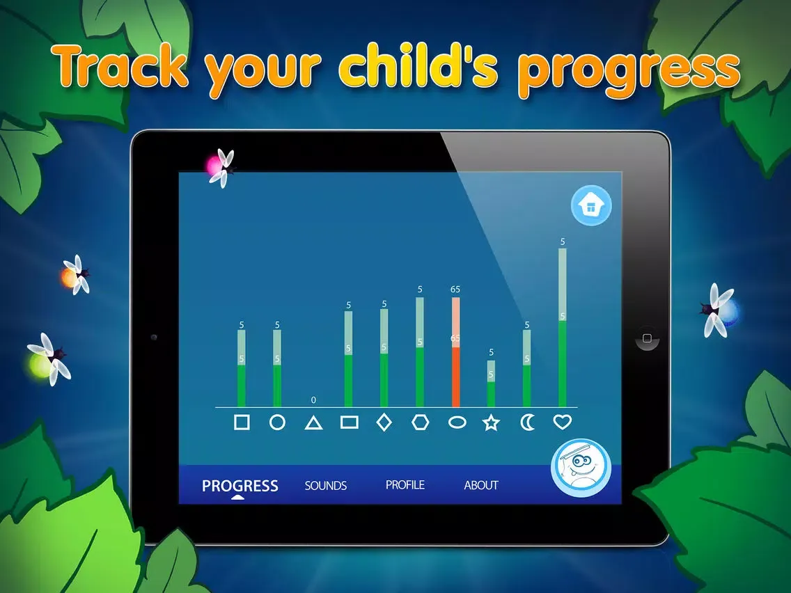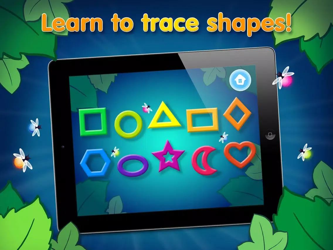 Toddlers are encouraged to learn about shapes through interactions with engaging animations and sounds. There are 10 shape that kids will have fun with guided with a professional voice over. Every time your toddlers complete an activity, they collect shiny fireflies that can be released in the end of the game. Lively music, full voice over and sound effects respond to the child’s efforts with positive encouragement and congratulations as appropriate.