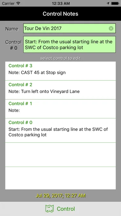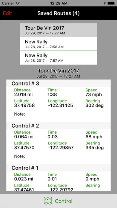 The time, speed, and distance shown immediately below the map are measured from the prior control to the current position along the course. When the "+ Control" button is touched, these amounts along with the latitude, longitude, and heading at the control are added to a list. Additionally, a note for that control number is added and available for editing on a pop-up view accessed by touching the "Note" button or icon in the lower right-hand corner of the screen.