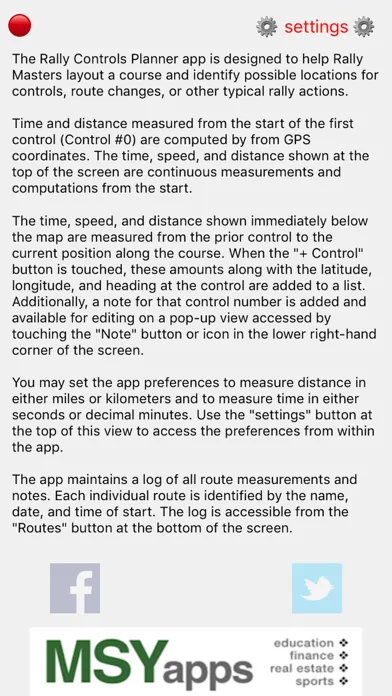The Rally Controls Planner app is designed to help Rally Masters layout a course and identify possible locations for controls, route changes, or other typical rally actions.
