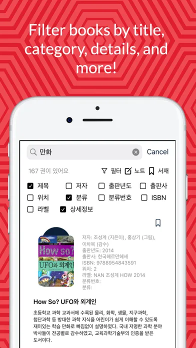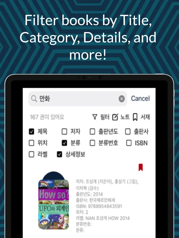 Search keywords by title, author, published year, publisher, location, category, category number, ISBN, label number, and book details. Multi-selection is available.