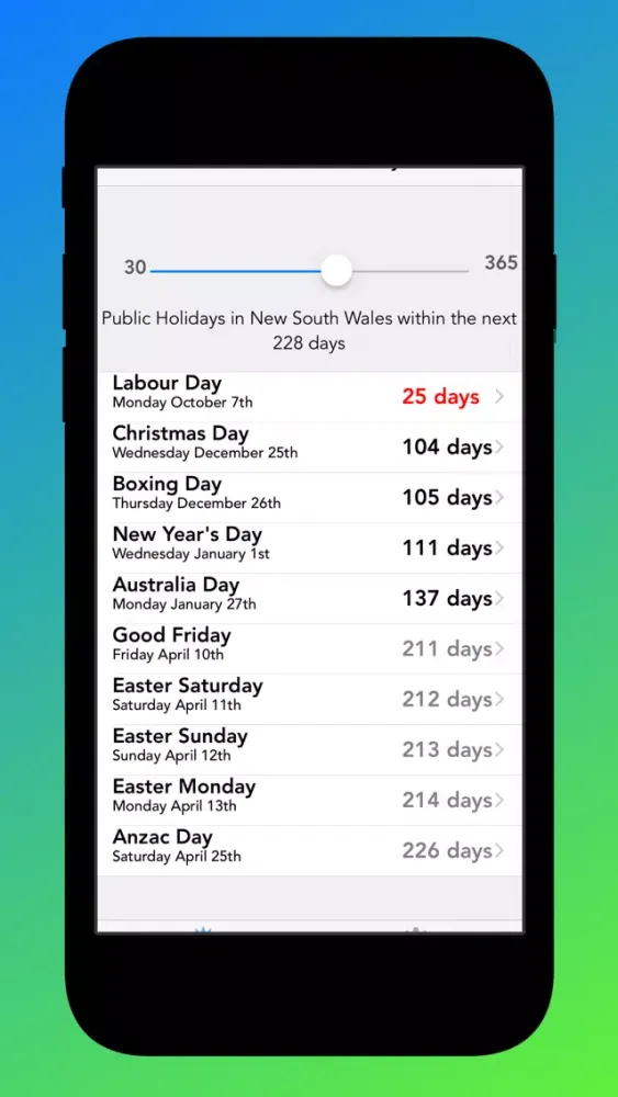 Want to know which public holidays are coming up? Want to know how long you need to wait until you get a day off work?