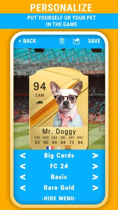 Unleash your creativity with personalized FC 24, FUT 23, and FUT 22 card designs. Seamlessly incorporate your own images and effortlessly sculpt a unique design. Tweaking stats is a breeze – just a tap away!