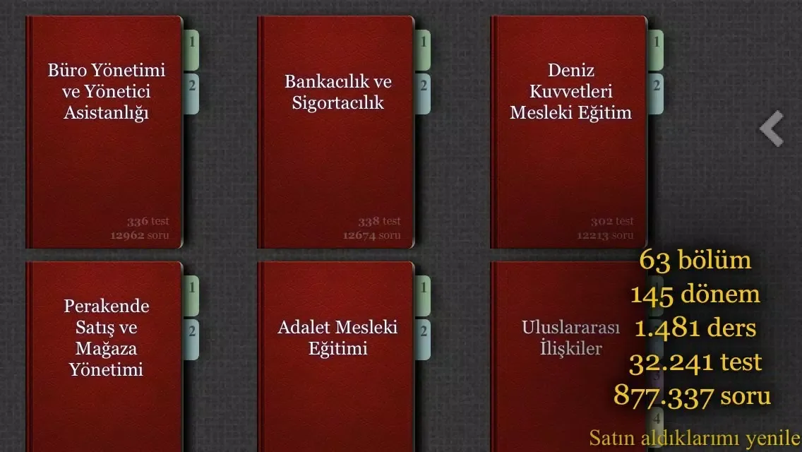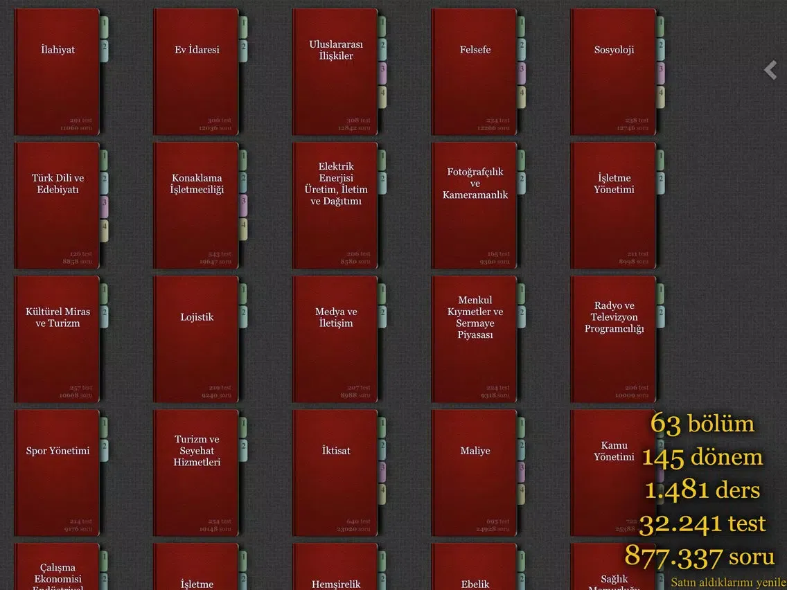- 63 bölüm, 145 bölüm dönemleri, 1.481 ders, 32.241 test, 877.337 soru bulunmaktadır,