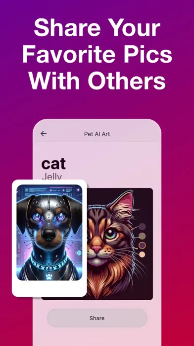 - Share the Love: Easily share your AI-generated pet portraits with friends and family or on social media platforms with built-in sharing options.