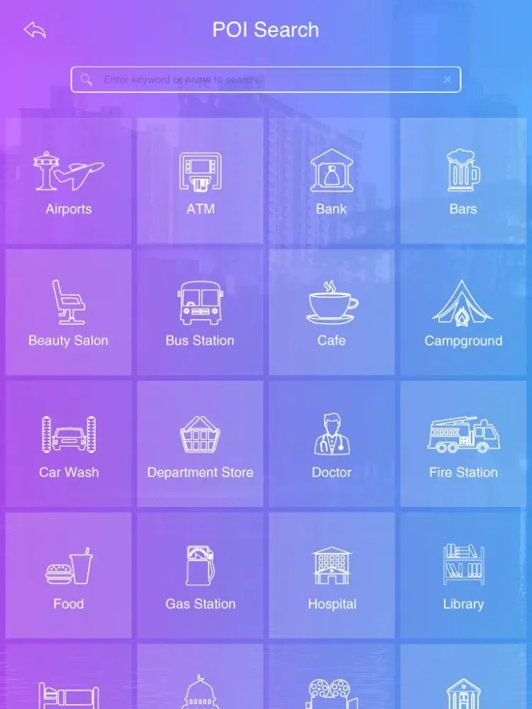 Airport, ATM, Bank, Bars, Beauty Salon, Bus Station, Cafe, Campground, Car Wash, Department Store, Doctor, Fire Station, Food, Gas Station, Hospital, Library,Lodging, Mosque, Movies, Museum, Park, Parking, Pharmacy, Pizza, Police, Shopping, Stadium, Taxi, Train Station, Travel Agency, University, Zoo.