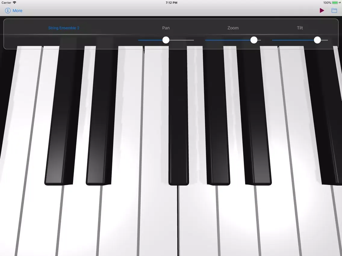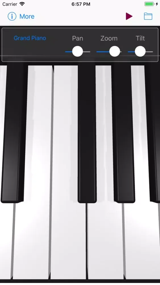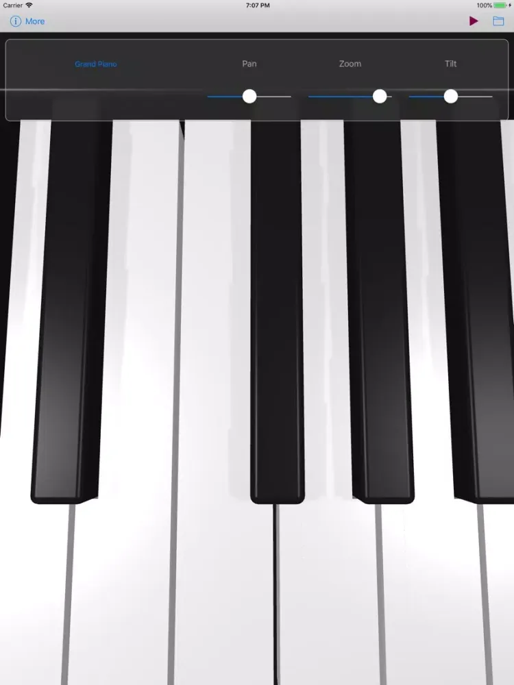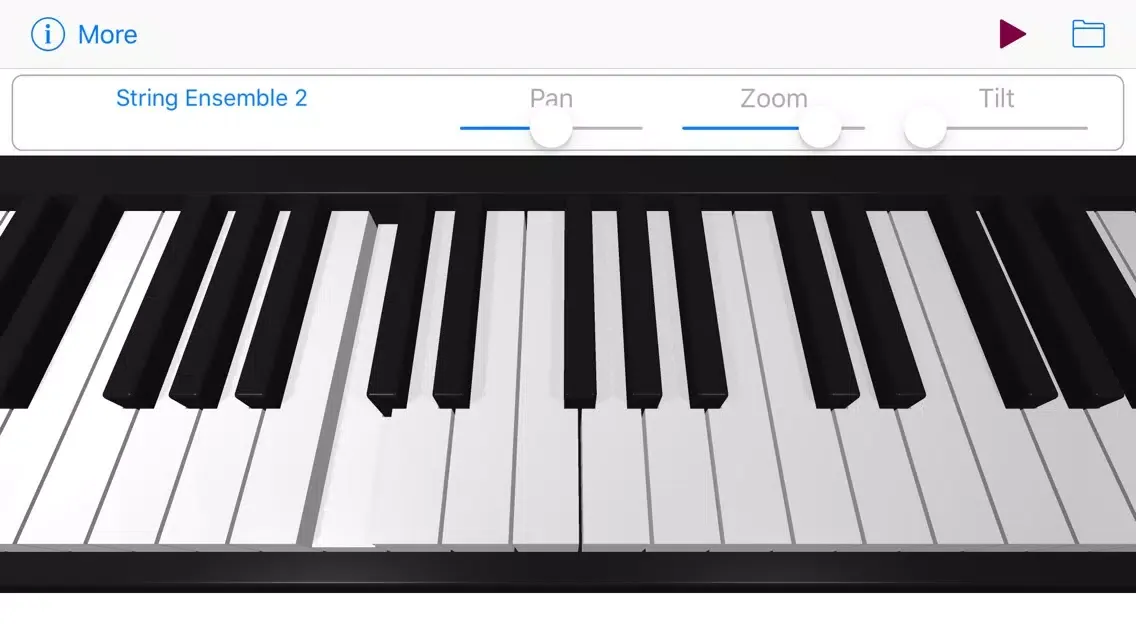 Use the Pan, Tilt, and Zoom controls at the top of the screen to precisely adjust the keyboard into the most comfortable playing position, and to view the portion of the keyboard that you need in order to play a particular piece of music.