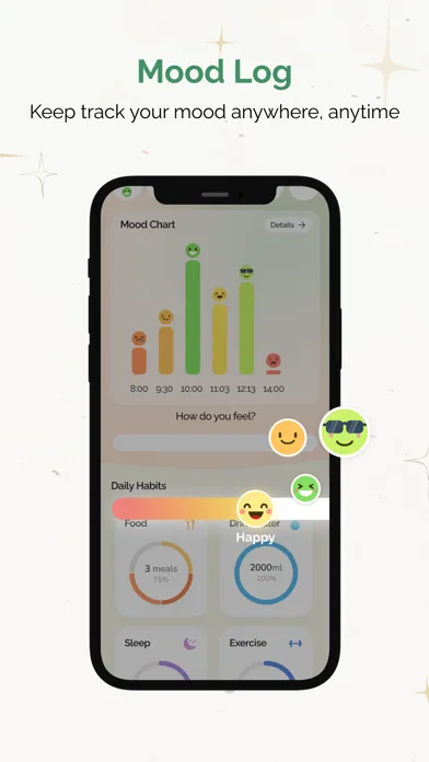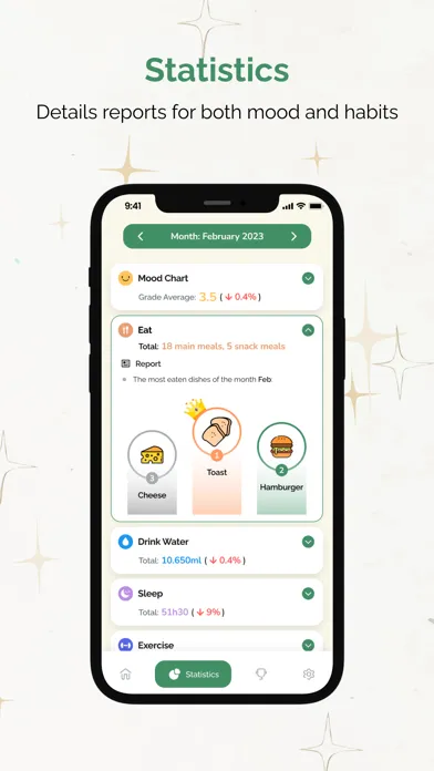 - Discover detailed Mood, Eating, Drinking, Sleeping, Exercising interesting stats of your life on weekly, monthly, or yearly charts
