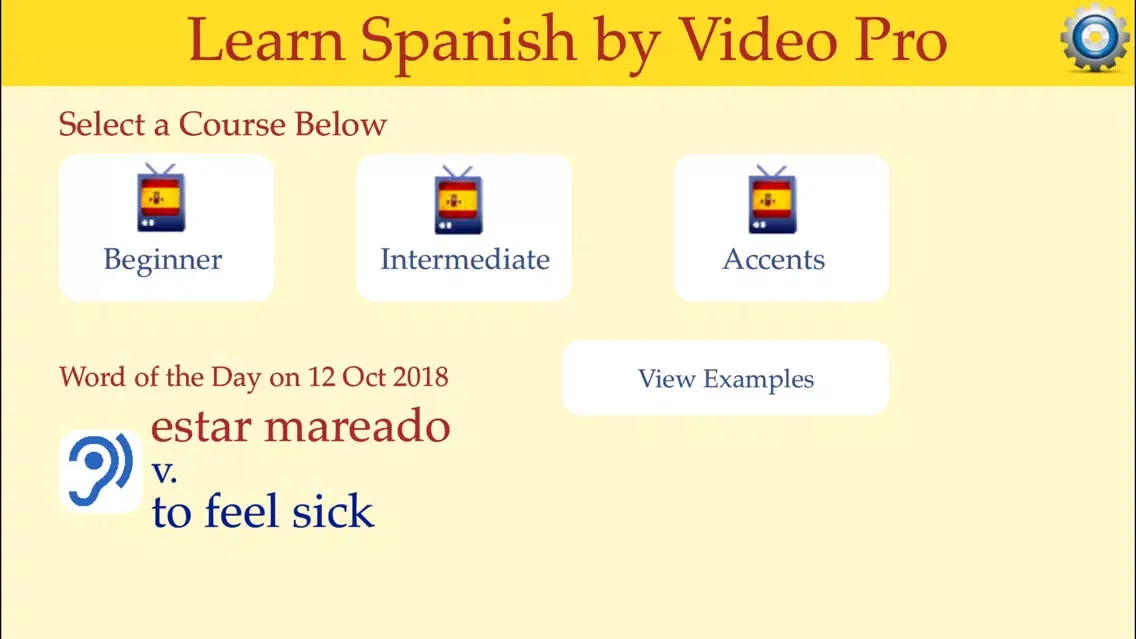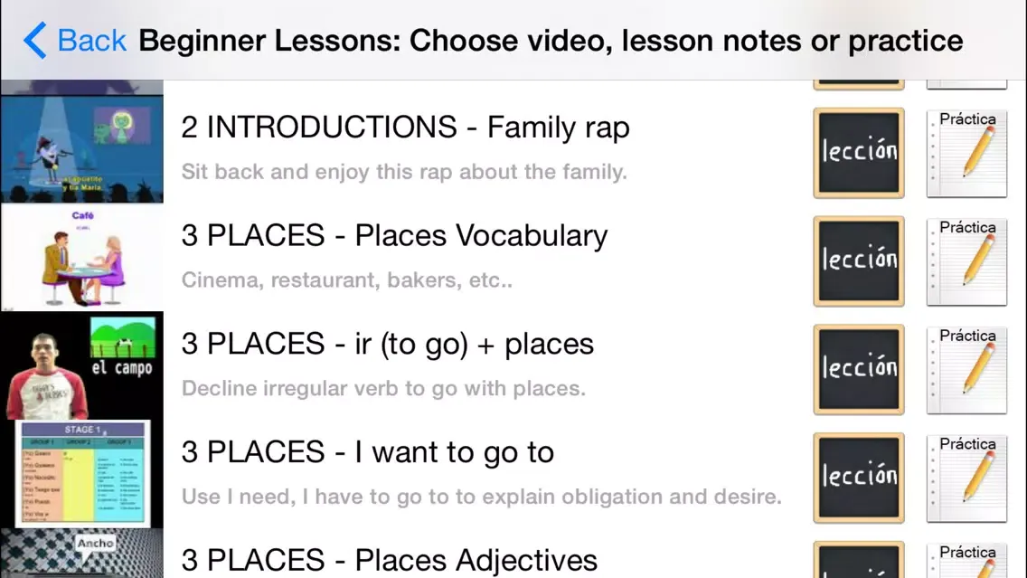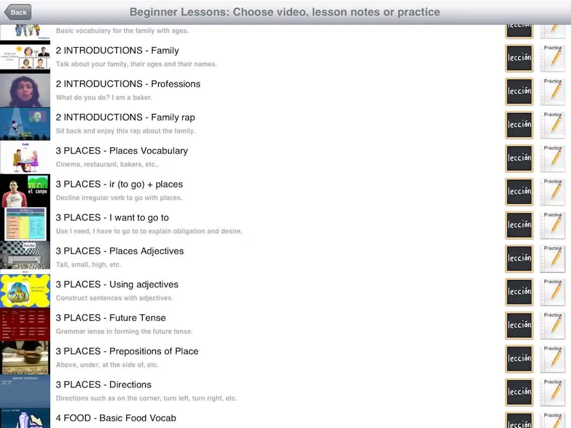 Beginners Course has 10 chapters (100 lessons): Basics, Introductions, Places, Food, Weather, Routines, Health, Travel and Transport, Grammar Builder and Vocab Builder. talk about the weather, travel and transport. Intermediate Course has 7 chapters (100 lessons): Revision Tenses Pronunciation Subjunctive Grammar Common Mistakes Culture Accents Course: A video from each country where Spanish is the principal language.