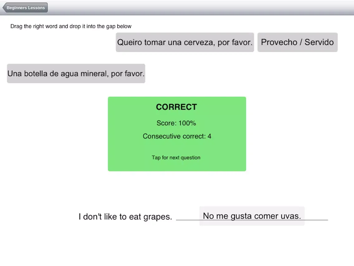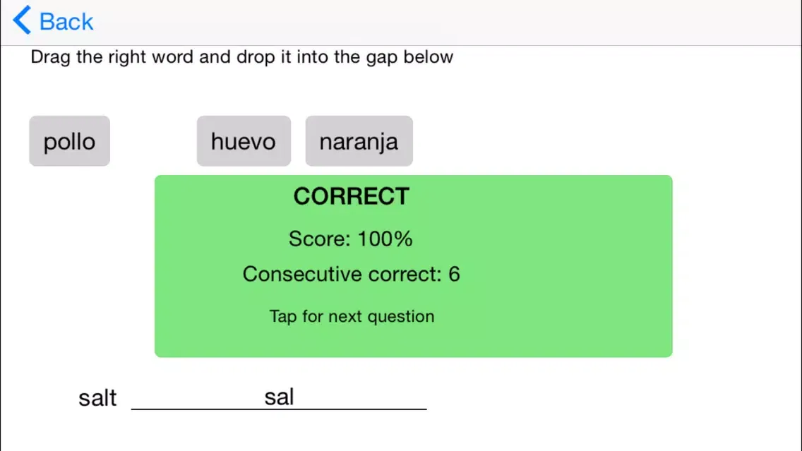 Practice: Each video has a quiz where the main teaching point is challenged through a drag and drop quiz. Testing your Spanish knowledge can be done offline.