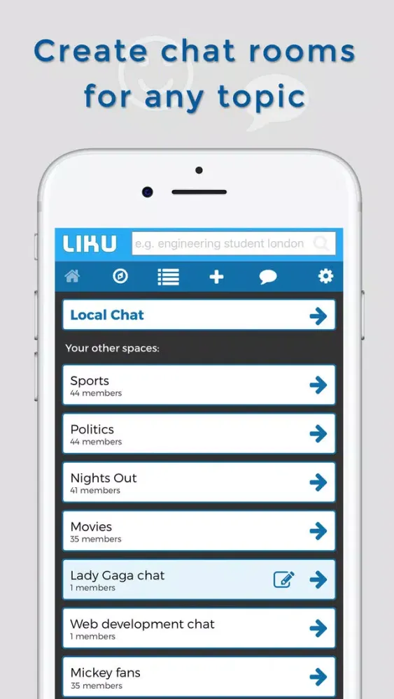 Liku lets you meet people nearby to you and from across the world who share the same interests, and create and join dynamic chat spaces on any topic.