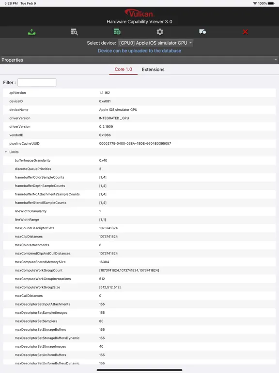 For developers using Vulkan layered over the Metal graphics API, this tool enumerates all the hardware capabilities and limitations of the device it is run on. A report of the current device is uploaded to a central Vulkan Capabilities database at gpuinfo.org where other developers can use this information to ensure their games and 3D apps are ready for as wide a variety of iOS device generations as possible.