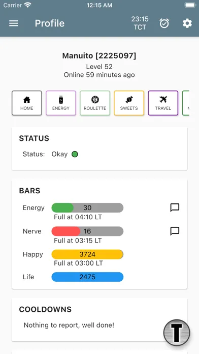 * Profile page with shortcuts to you preferred sections, access to basic status data, recent events, cooldowns and net-worth calculation. You can also manually activate notifications so that you don't waste any energy, nerve, or miss any cooldown expiry.