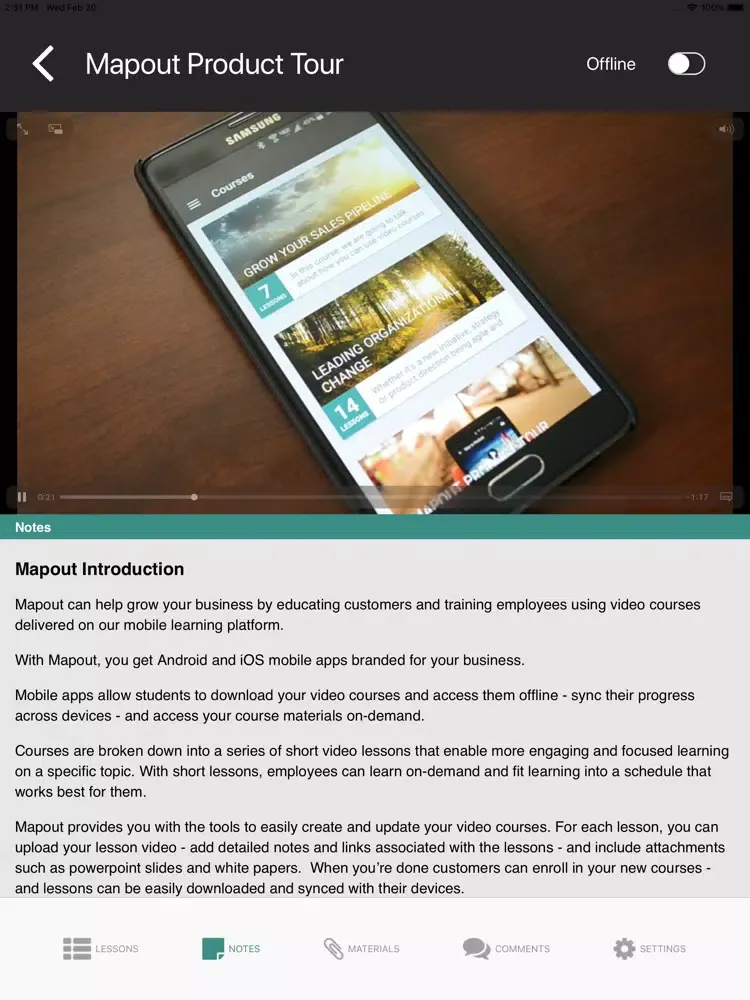 With Mapout, you get apps branded for your organization. Students can access your video course materials on-demand, sync their progress across devices and download course materials for offline viewing.
