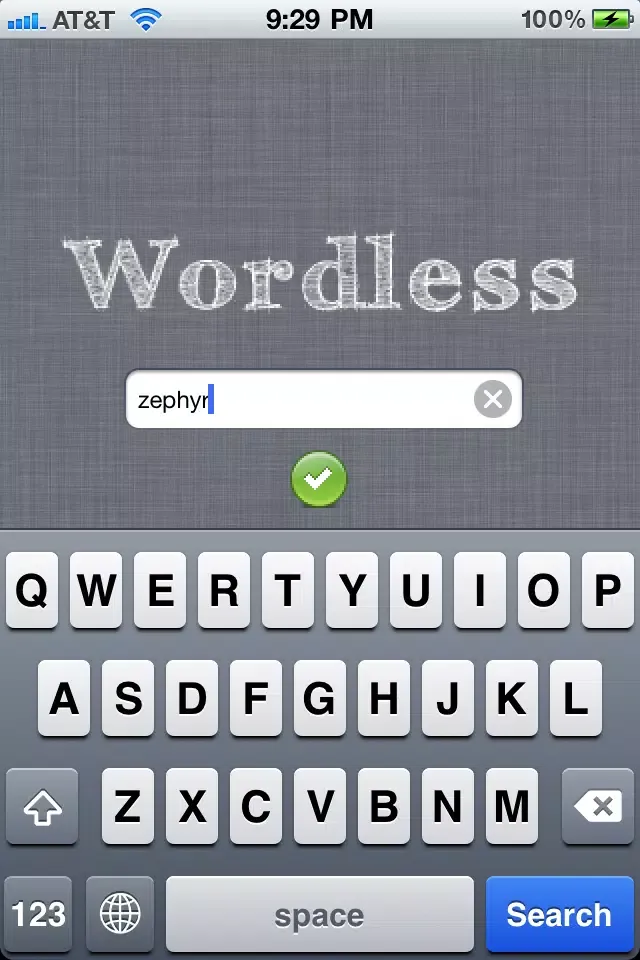 Wordless is your secret to winning Scrabble and Words with Friends. Not sure if a word is valid, just type it in and check. You can also tap the Wordless logo and it'll flip to a list of 2 and 3 letter words.
