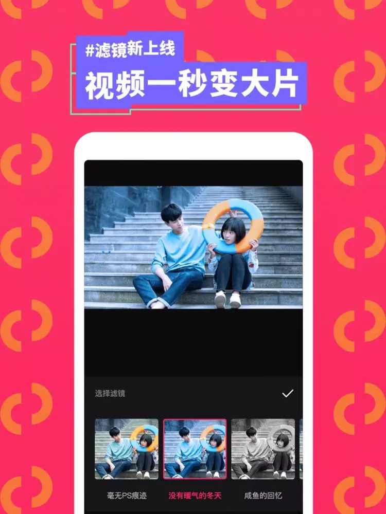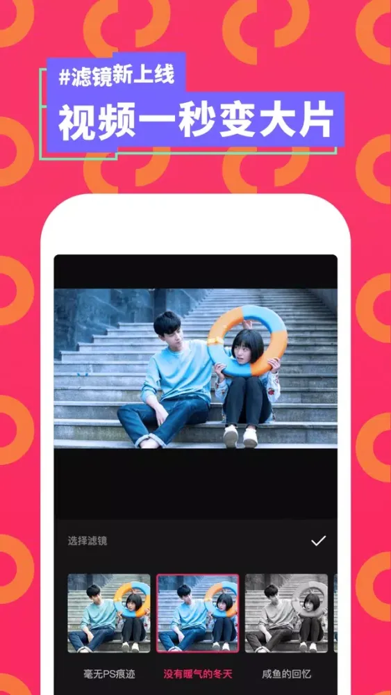2、【多款滤镜】新增滤镜功能。提供10余款滤镜,在剪辑好的视频上直接添加,瞬间让你的短视频成为时尚大片。
