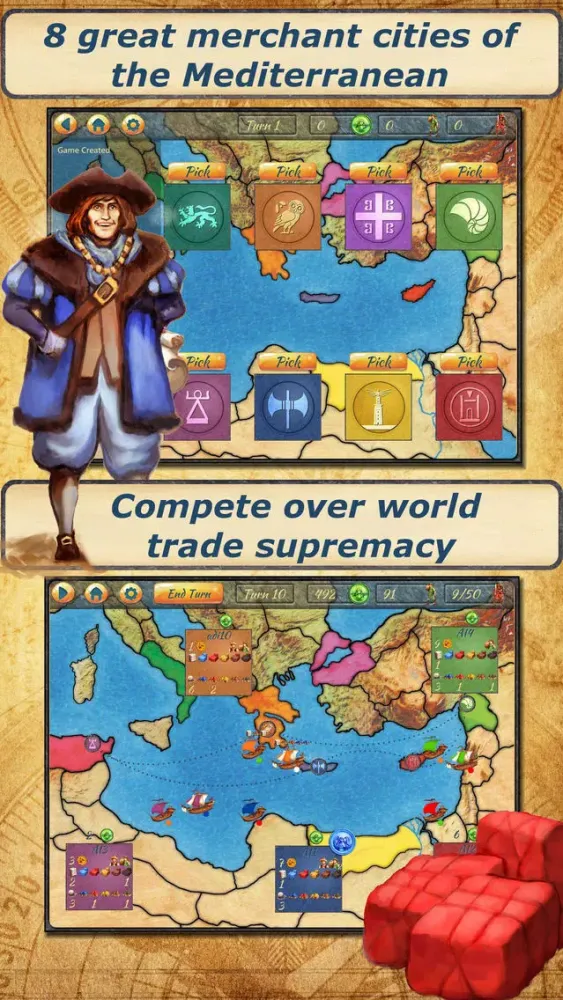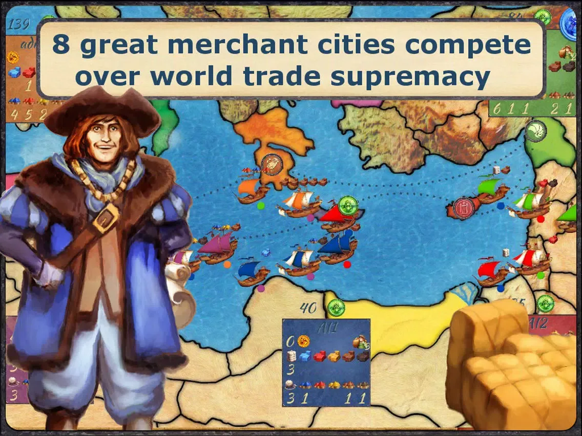In this game you will be competing against up to 7 other players, each positioned in one of the great old merchant cities of the Mediterranean sea.