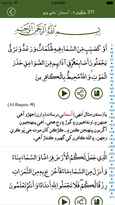 With this Islamic book app, you are getting Hafizi quran with real page-curl experience. This is not just a textual app, it is an audio Quran app. You can listen telwat of Quran ayats continuously (internet connection required). You can search words or topic in Sindhi on this Quran app. Bookmark the ayat / verse you like / quote. Share the ayat / verse you want.