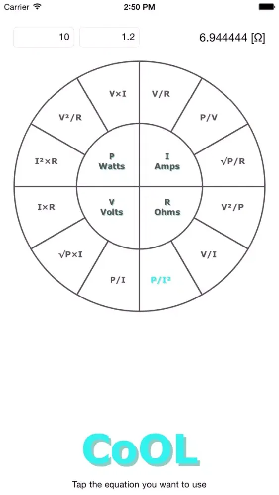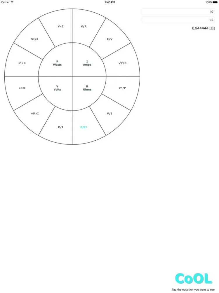 With the Circle of Ohm's Law you can calculate several values of Ohm's law! With the simple and intuitive interface all you have to do is tap the formula you want to use.
