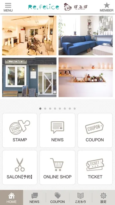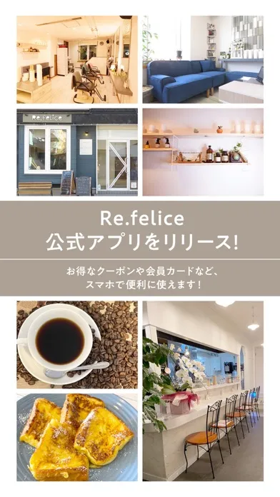 アプリからヘアサロンのご予約や、最上級品ばかりを揃えたRe.feliceならではの美容専売品やオリジナルシャンプー、焙煎したてのぽるぽの珈琲豆や調理器具、等もご購入いただけます。
