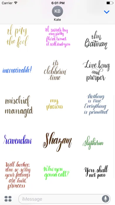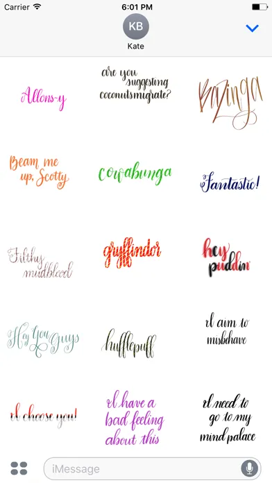 With the Take Heart Calligraphy Geek Sticker Pack, you can send beautiful and witty quotes from all of your favorite movies and TV shows to all your friends from within the iMessages app! This pack includes a variety of nerdy quotes that you can send to your friends when typing the words just isn't enough.