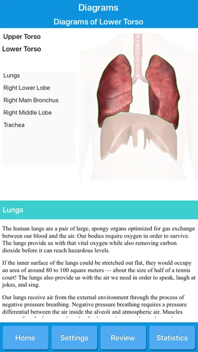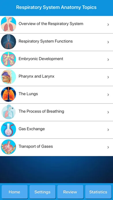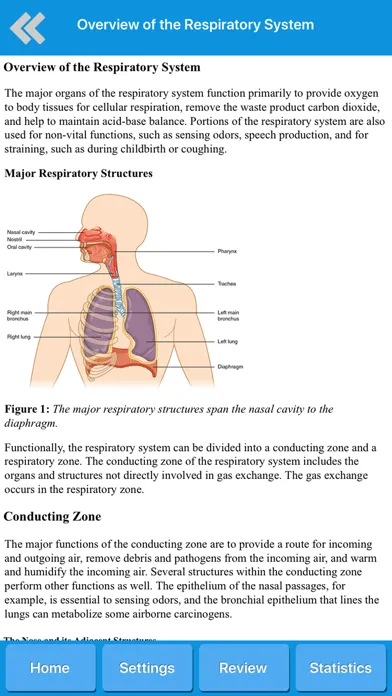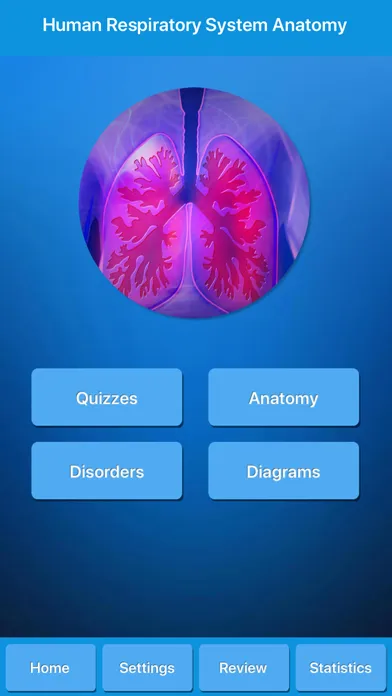 Get respiratory system anatomy, common diseases, diagrams and quizzes. This app is suitable for students and for everybody willing to learn more knowledge about human pulmonary system, or even for medical professionals, nurses and teachers.