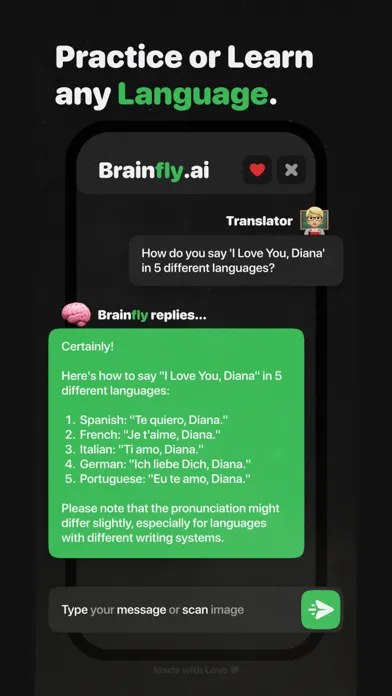 Brainfly's multilingual capabilities allow you to chat in any language you desire. Translate text, learn, and practice your language skills. Let Brainfly be your language tutor!