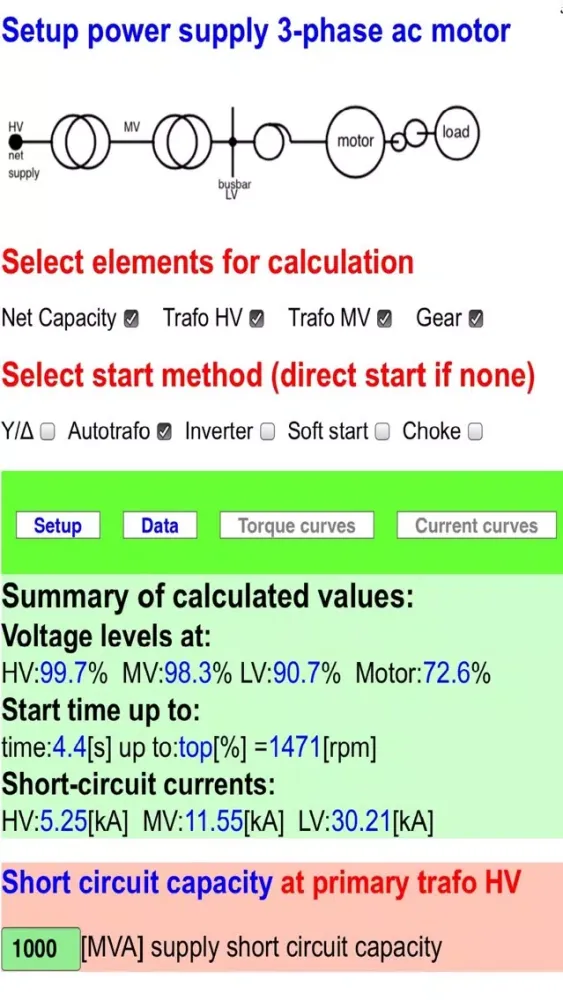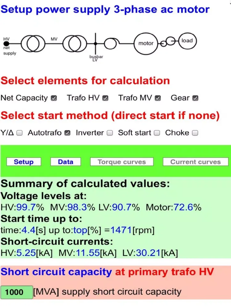 „ac-motor start“ represents a tool for professionals (engineer, site manager, site designer, maintenance personal) to estimate the behavior of the supply network and the drive at the start of the motor.