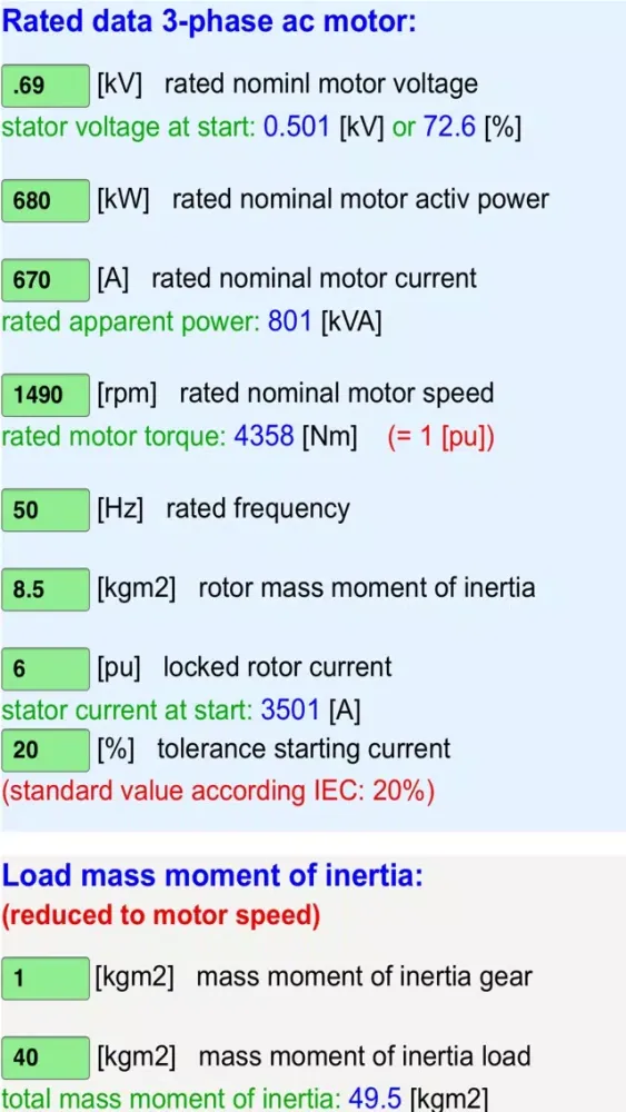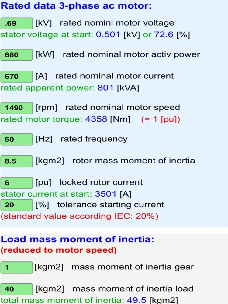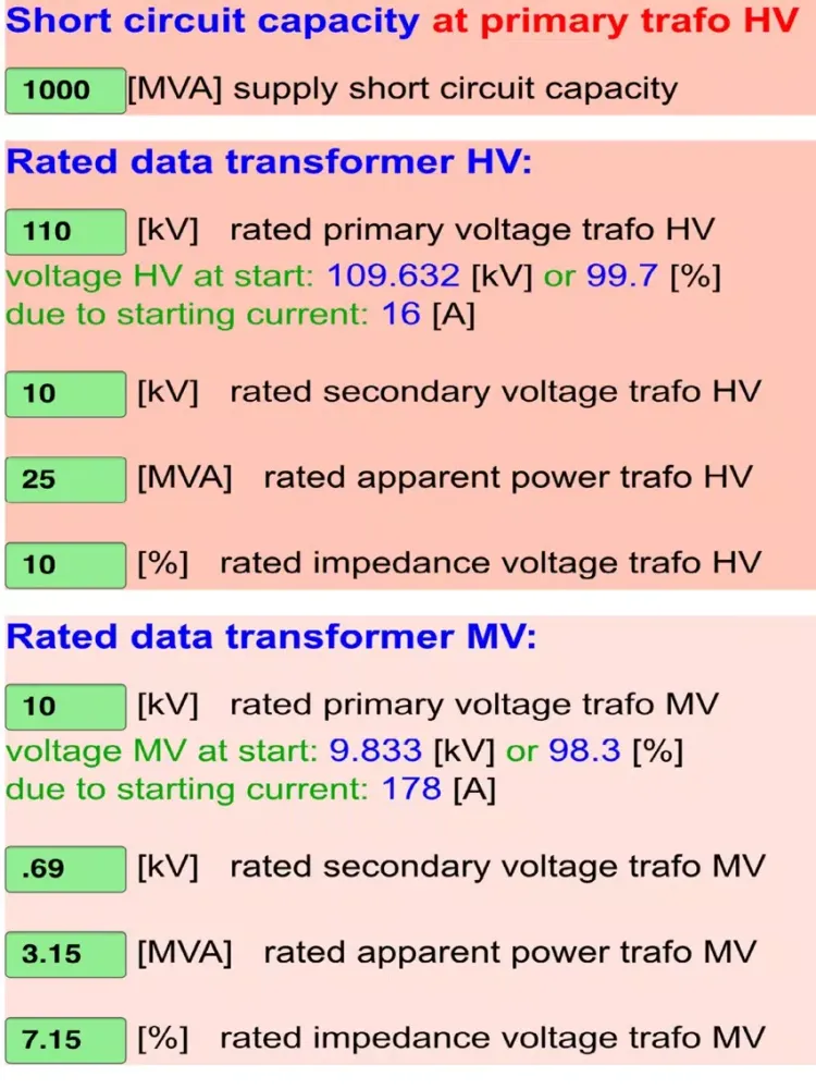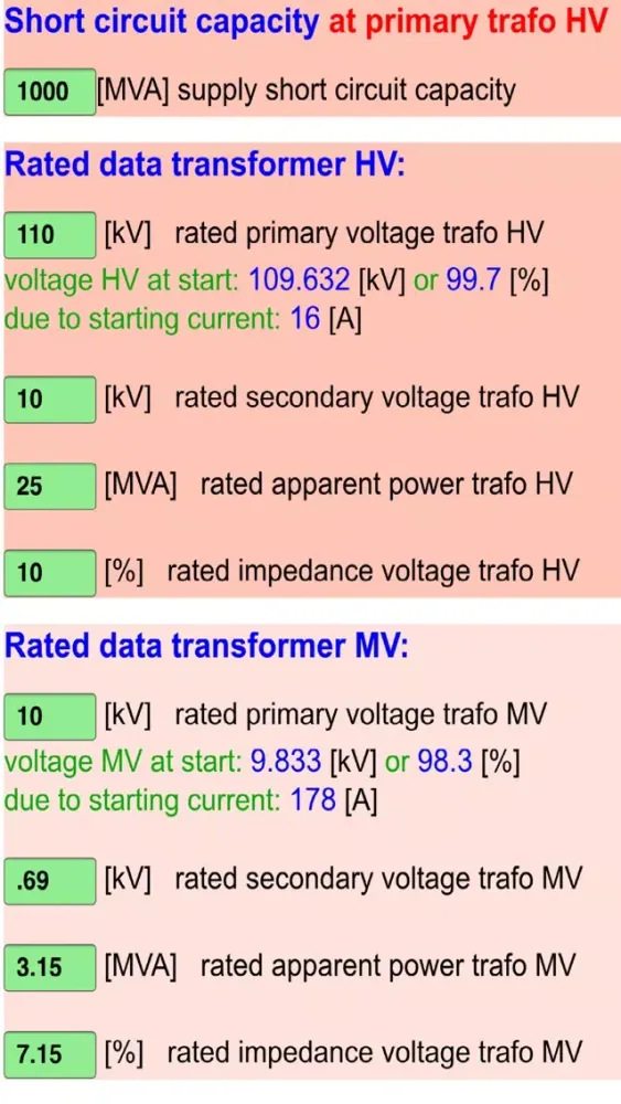 According these data the resulting voltages on the different voltage levels and the resulting start up time will be calculated. In case that the data of the feeding net or that the transformers should not be included in the calculation, its influence on the voltage drop will be unaccounted. The relevant input boxes will be invisible.