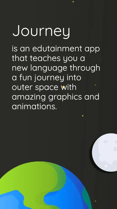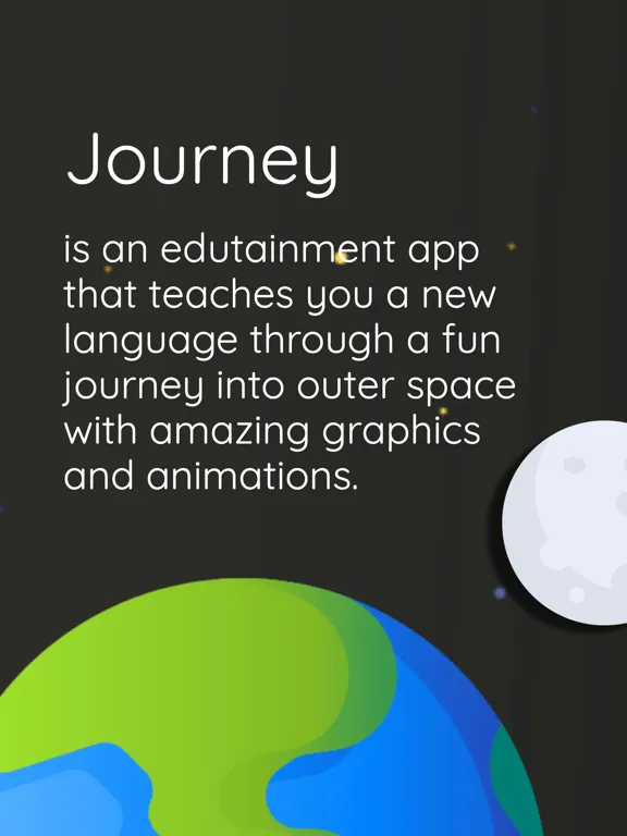 Journey is an edutainment (fun) app that teaches you a new language through a fun journey into outer space with amazing graphics and animations.