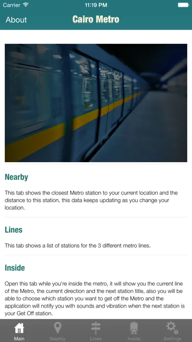 يحتوي هذا التطبيق علي العديد من الخدمات التي تساعد مستخدم مترو الأنفاق و يوفر معلومات عن خطوط المترو و المحطات