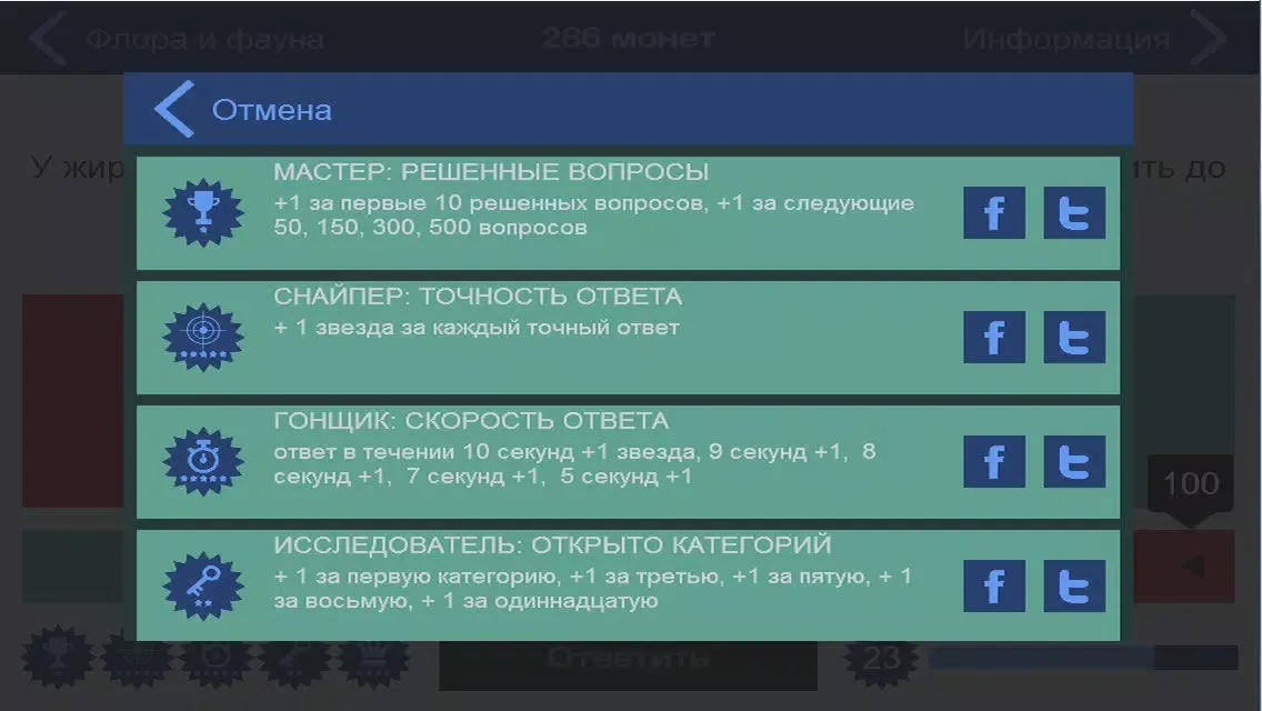 9. Шаринг результатов в социальные сети Facebook и Twitter.