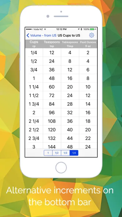 The Cooking Converter app provides tables for unit conversion instead of forcing you type in numbers; especially useful for avoiding the tedious task of converting multiple values. To use: