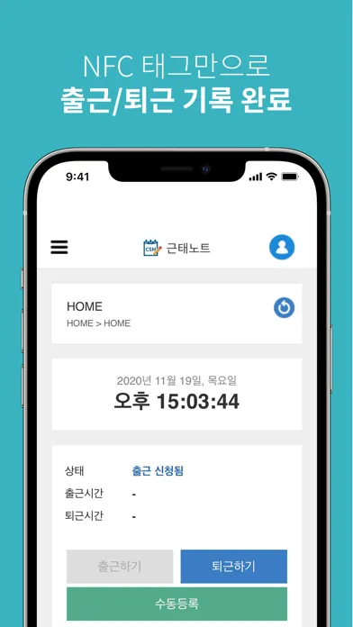 *NFC 태그를 이용한 출근은 NFC 기능이 있는 IPhone 7 이상부터 사용 가능하며, 이전 버전의 경우에는 수동출근신청을 이용하셔야합니다.