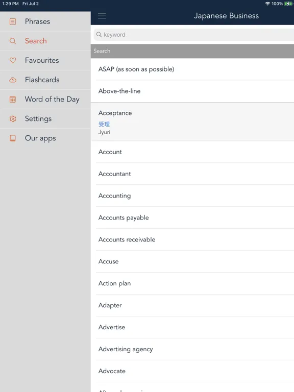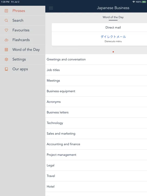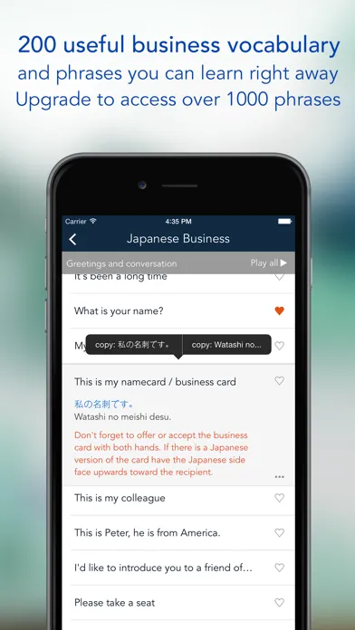 Japanese Business is free to download and comes with 200 useful phrases you can learn right away. If you find the app useful you can upgrade via in app purchase to access over 1000 phrases carefully categorised into 19 business topics. Each phrase professionally translated and recorded by native Japanese speakers.