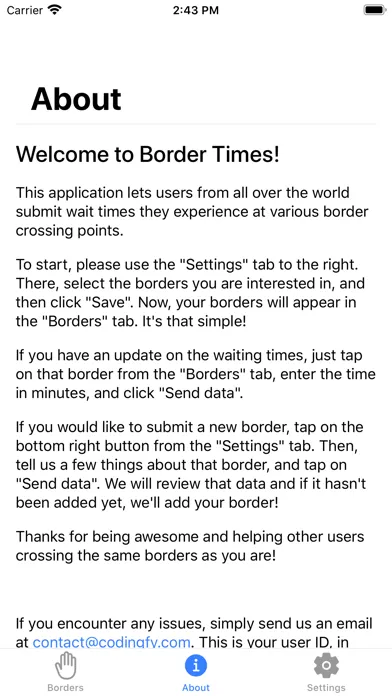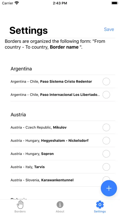 Can't find your border crossing in the app? If we are allowed to hold data about that particular border, chances are we don't know about it yet. Just fire the app, press the "+" sign from the Settings tab and submit the information about the border. It will be reviewed by our team and if we have all the data we need, we'll post it! We accept borders from all continents!