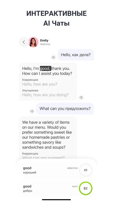 * Интерактивное общение с AI-персонажами: Развивайте разговорные навыки, взаимодействуя с нашими более чем 40 AI-персонажами, которые адаптированы для максимального погружения в языковую среду. Они помогут вам не только исправить ошибки, но также и предложат как можно улучшить ваши фразы.
