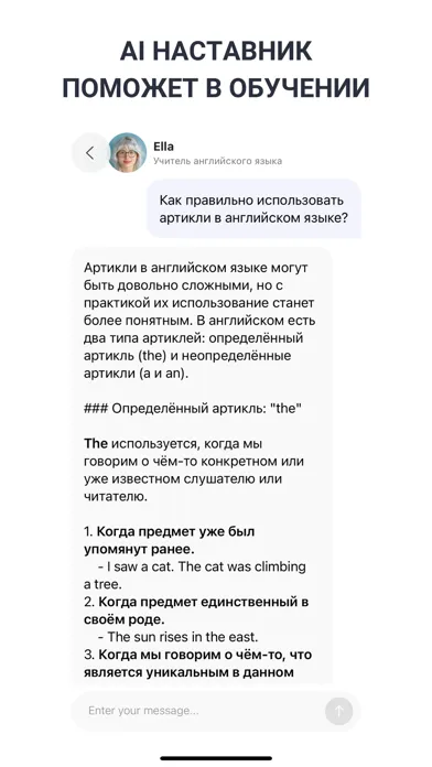 * AI Преподаватель: Наш AI Преподаватель функционирует как ваш личный наставник, который подсказывает, направляет и объясняет сложные аспекты языка, обеспечивая глубокое понимание материала.