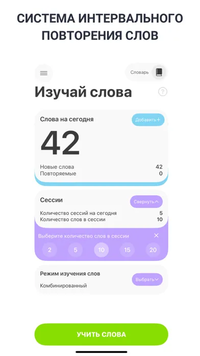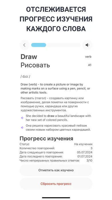 * Интервальное повторение слов: Используйте нашу продвинутую систему повторения для улучшения запоминания слов и фраз.