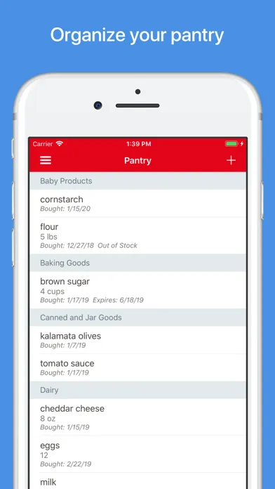 • Add custom ingredients to the pantry. Track quantities, purchase dates, and expiration dates.